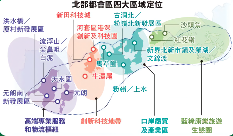 北部都會區的發展已進入實質落地階段:企業進駐、基建啟動、政策精簡,配合四大功能區的規劃,將逐步形成一個 融合「居住、創科、商貿、生態」的全新城市藍圖。未來十年,這裡將是香港與大灣區合作的重要平台,也是香港經濟與樓市的增長引擎。